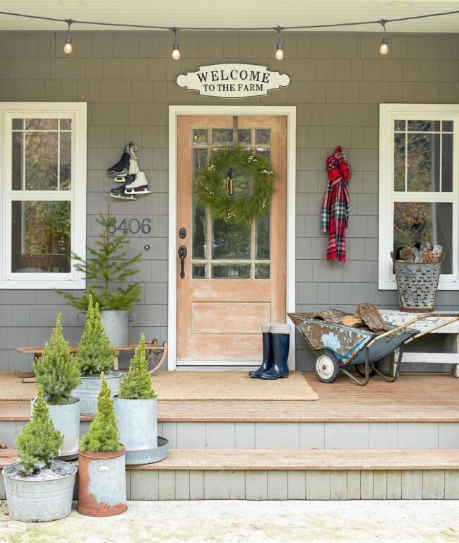 Farmhouse charm is highlighted through warm welcome at the front door, drawing you into its rustic allure. Earthy tones harmonize with natural textures, while twinkling lights create an inviting atmosphere in any season.