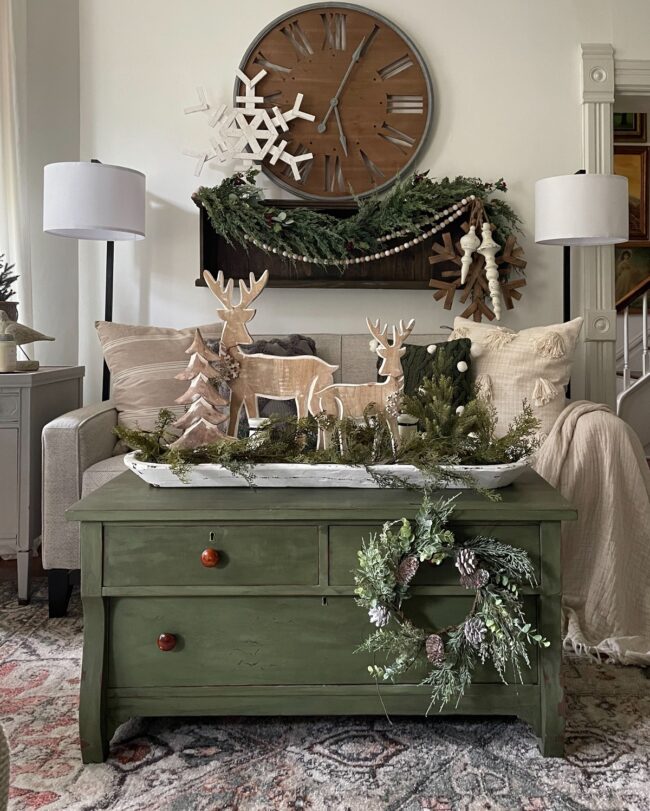 Rustic holiday retreat is defined by natural elements, inviting textures, and warm accents that create snug atmosphere. beautifully aged green coffee table serves as the heart of this space, adorned with charming arrangement of wooden figurines and greenery.