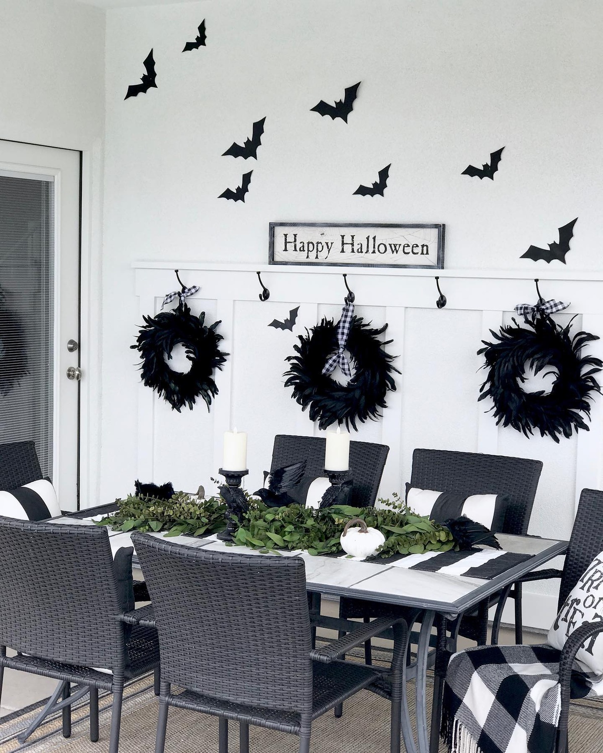 Classic black and white Halloween decor creates a sophisticated yet spooky patio atmosphere.