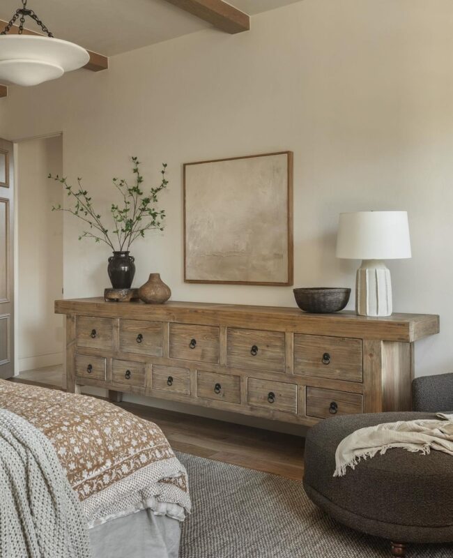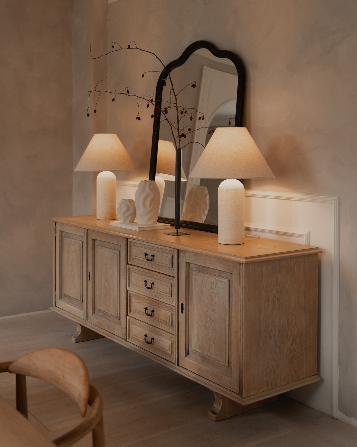 Rustic elegance defines this inviting decor concept, where natural materials harmonize with soft hues to create serene atmosphere. The textured sideboard draws attention, complemented by muted lighting that sets warm tone for any space.
