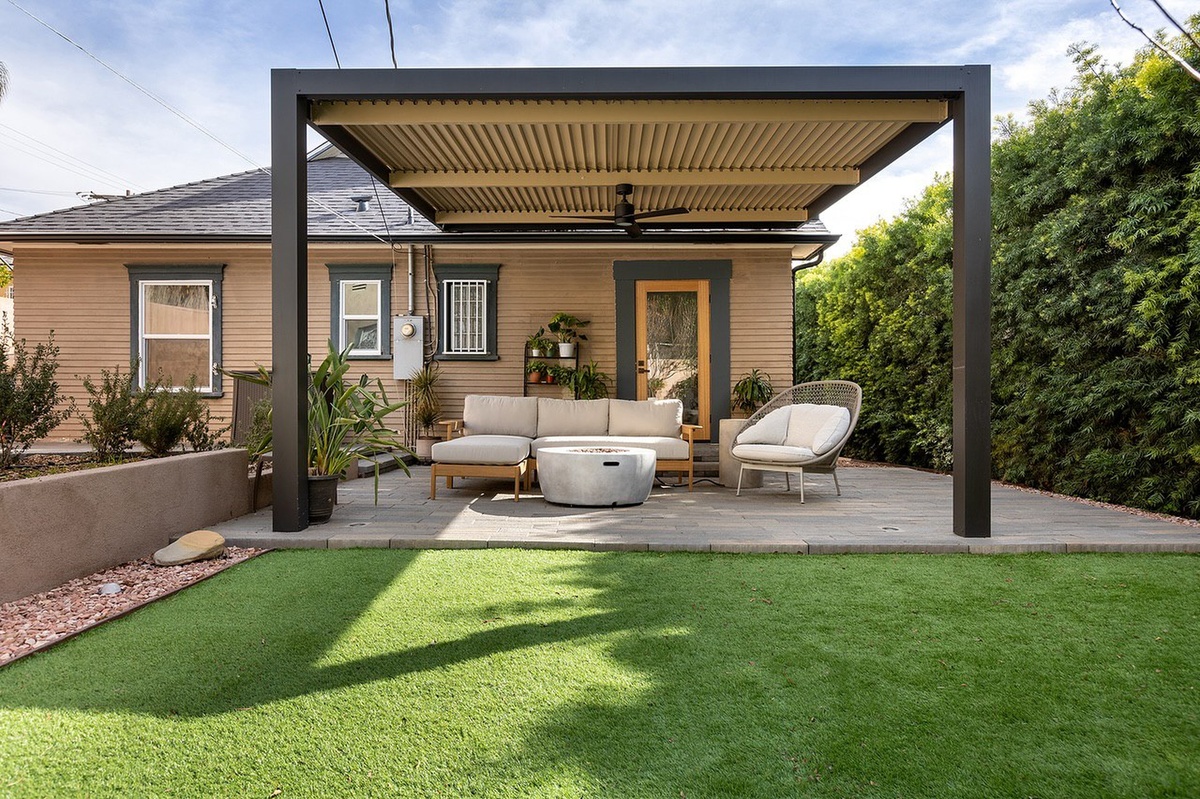The soft green lawn adds an inviting touch, while stylish overhead structure provides shade for sun-soaked afternoons or cozy evenings under twinkling lights. Neutral tones harmonize beautifully with earthy elements, creating seamless flow between indoor and outdoor living areas.