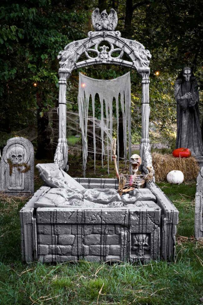 Skeleton resting in bed graveyard scene offers a fun and spooky twist to your Halloween decor.