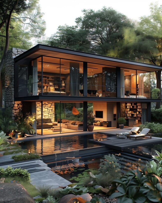 Mixed materials like wood, metal, stone, and glass create contrast and add depth to facades. Oversized windows and glass doors increase natural light and blur the line between indoor and outdoor spaces.