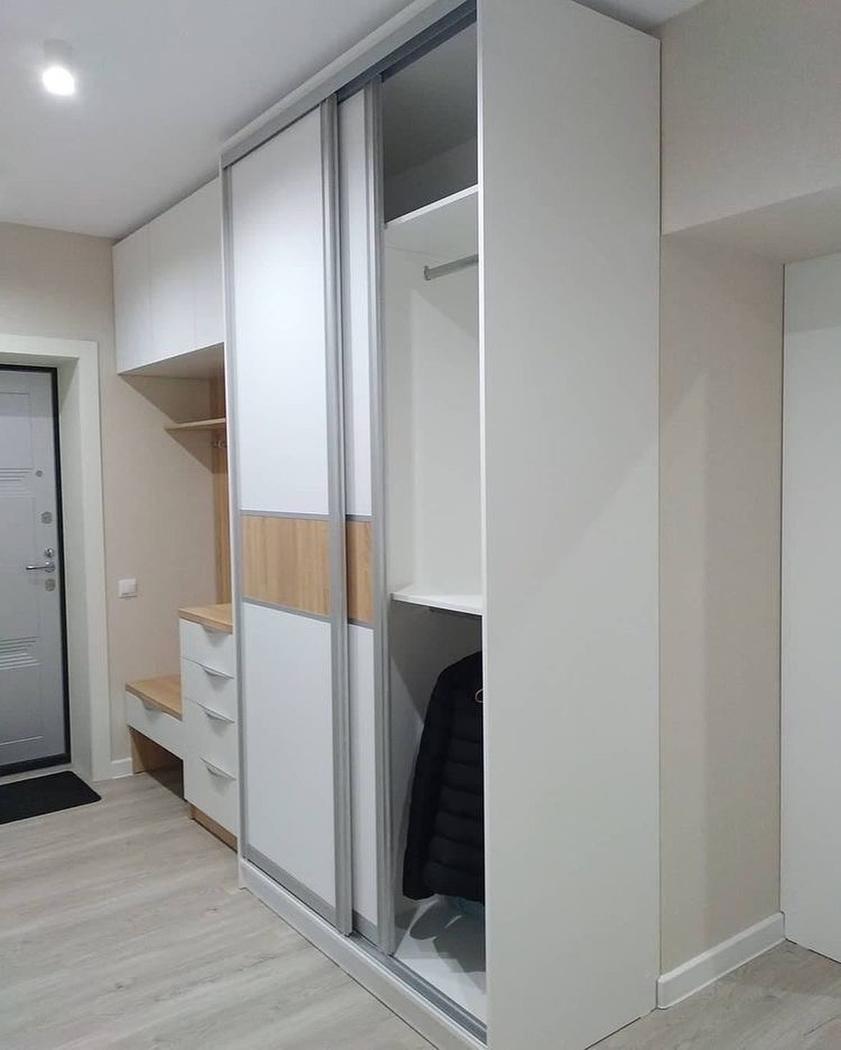 Practicality meets style with this entryway wardrobe design, combining ample storage space with easy access to coats, shoes, and accessories.