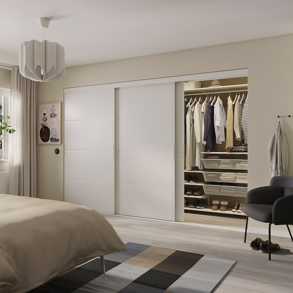 Sliding doors save space by moving horizontally rather than swinging outward, allowing more room for furniture or decor near the wardrobe.